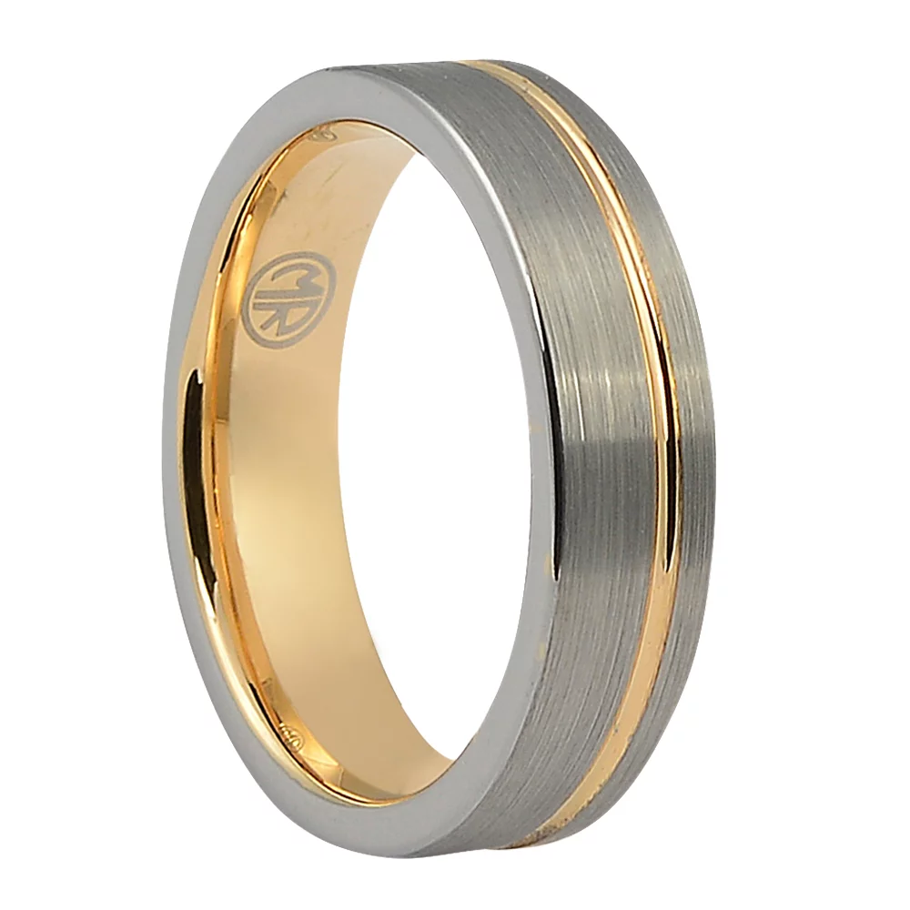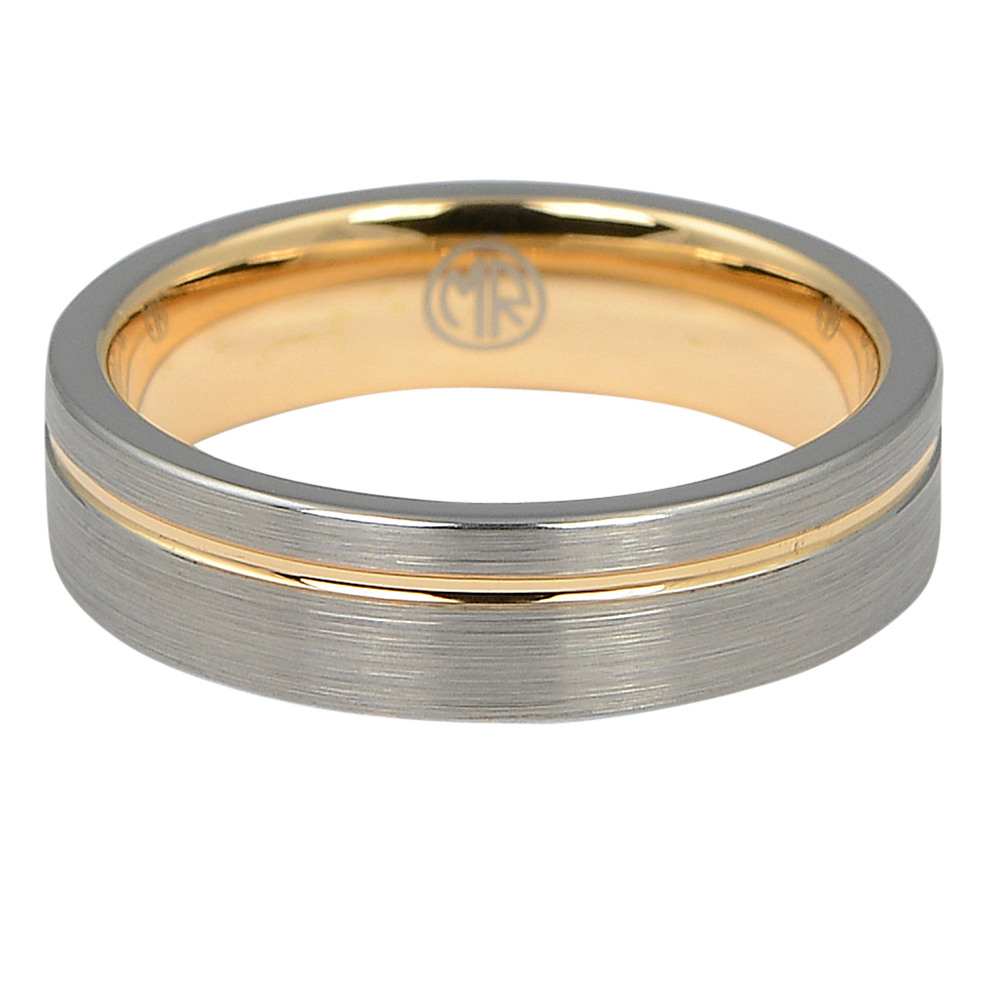 Our MRO Signature Range rings are designs that we have specifically selected as our favourite rings. They also include MRO Signature packaging, with premium wooden ring box. This design features a black brushed outer band, with offset golden groove. It also features a gold plated inner comfort fit band. Limited quantities available.