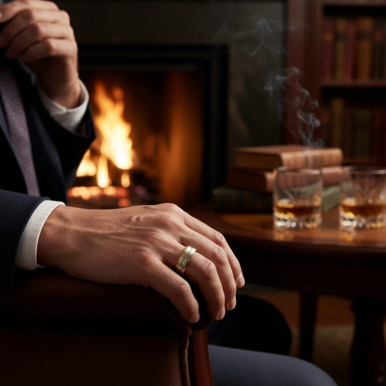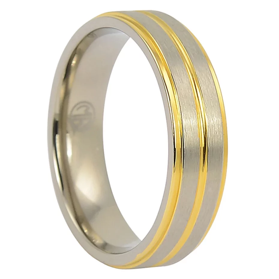 Titanium 6mm ring with gold-tone accents. The titanium base gives the band its strength and everyday durability, while the contrasting details are framed as accents, inlays or finish elements rather than the core material. Comfortable to wear daily with a clean modern look.
