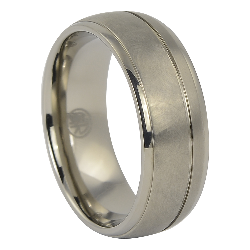 This asymmetrical titanium mens ring features a rounded distressed finish as well as a brushed finish separated by a single groove.