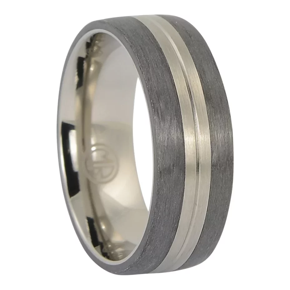 Titanium 8mm ring with brushed carbon fibre inlay. The titanium base gives the band its strength and everyday durability, while the contrasting details are framed as accents, inlays or finish elements rather than the core material. Comfortable to wear daily with a clean modern look.