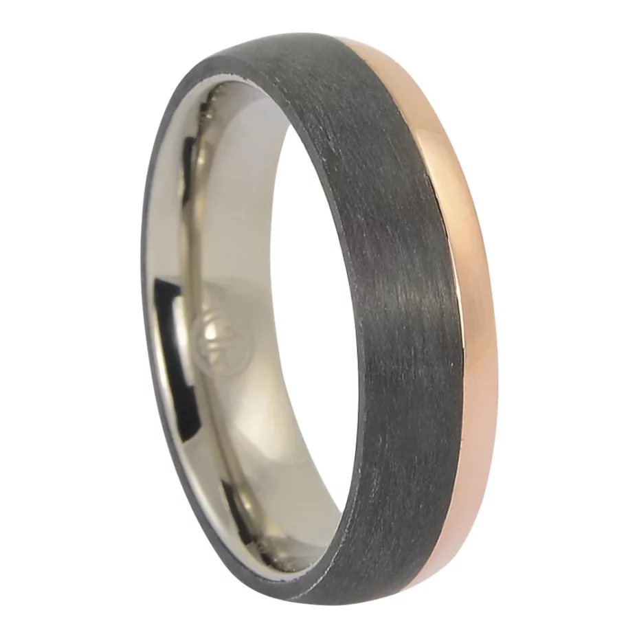 Titanium 8mm ring with rose gold-tone accents and carbon fibre accent. The titanium base gives the band its strength and everyday durability, while the contrasting details are framed as accents, inlays or finish elements rather than the core material. Comfortable to wear daily with a clean modern look.