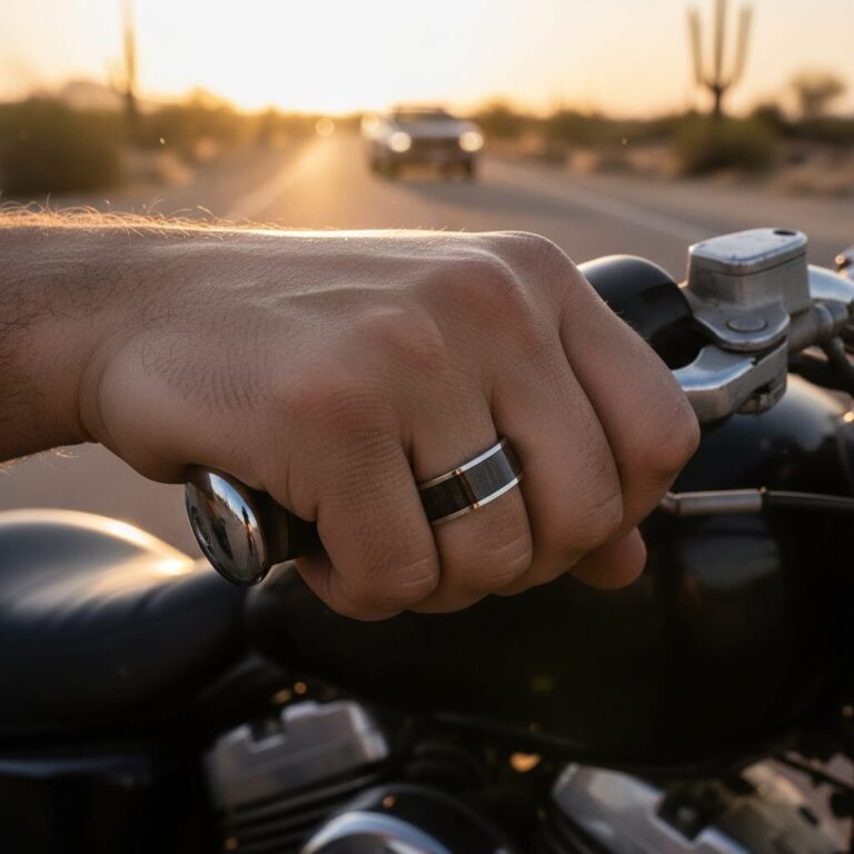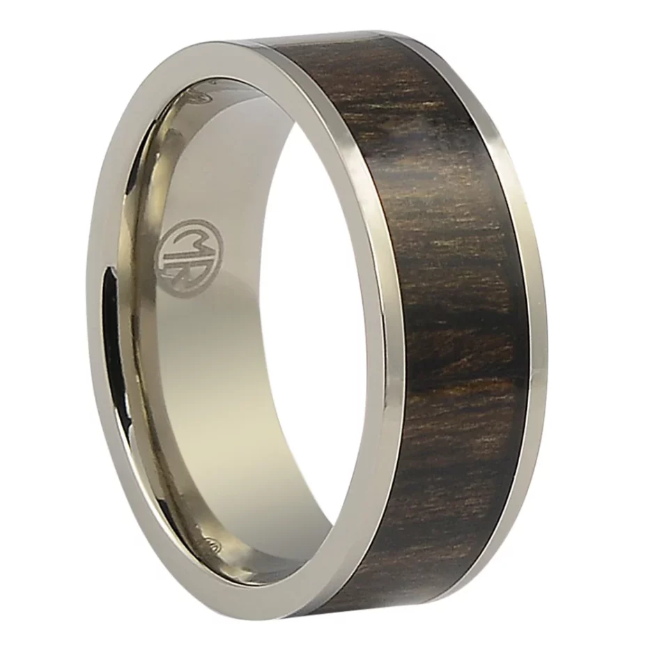 This ring combines titanium with a real wood inlay — each piece is unique because no two sections of timber look the same. The wood adds warmth and texture to a metal band, making it stand out from plain polished rings. This one comes in a 8mm width — The wood is sealed and protected but not completely waterproof — avoid prolonged soaking. Good for blokes who want something natural-looking and a bit different to the usual fare. The combination of metal and timber works well for outdoors types, woodworkers, or anyone who appreciates natural materials.