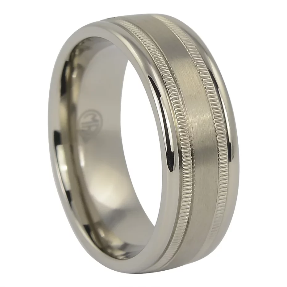 This titanium band is the low-maintenance option for blokes who'd rather not think about their ring. Titanium is incredibly hard-wearing — it handles the workshop, the gym, and the outdoors without complaint. Won't corrode, won't tarnish, and if you've got skin allergies, titanium is naturally hypoallergenic. This one comes in a 8mm width — Lightweight and strong, it sits comfortably through a full day's work. No special cleaning, no polishing ritual. Just put it on and forget about it.