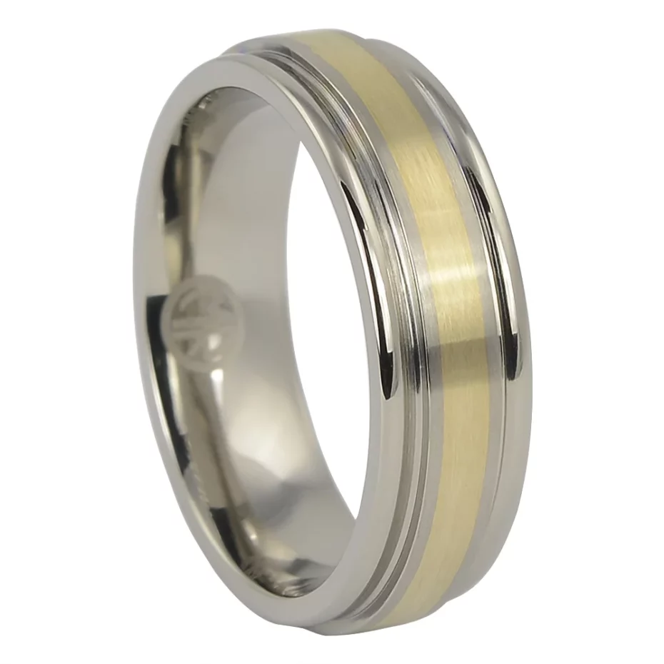 Titanium ring with solid 14k gold inlay. The titanium base gives the band its strength and everyday durability, while the contrasting details are framed as accents, inlays or finish elements rather than the core material. Comfortable to wear daily with a clean modern look.