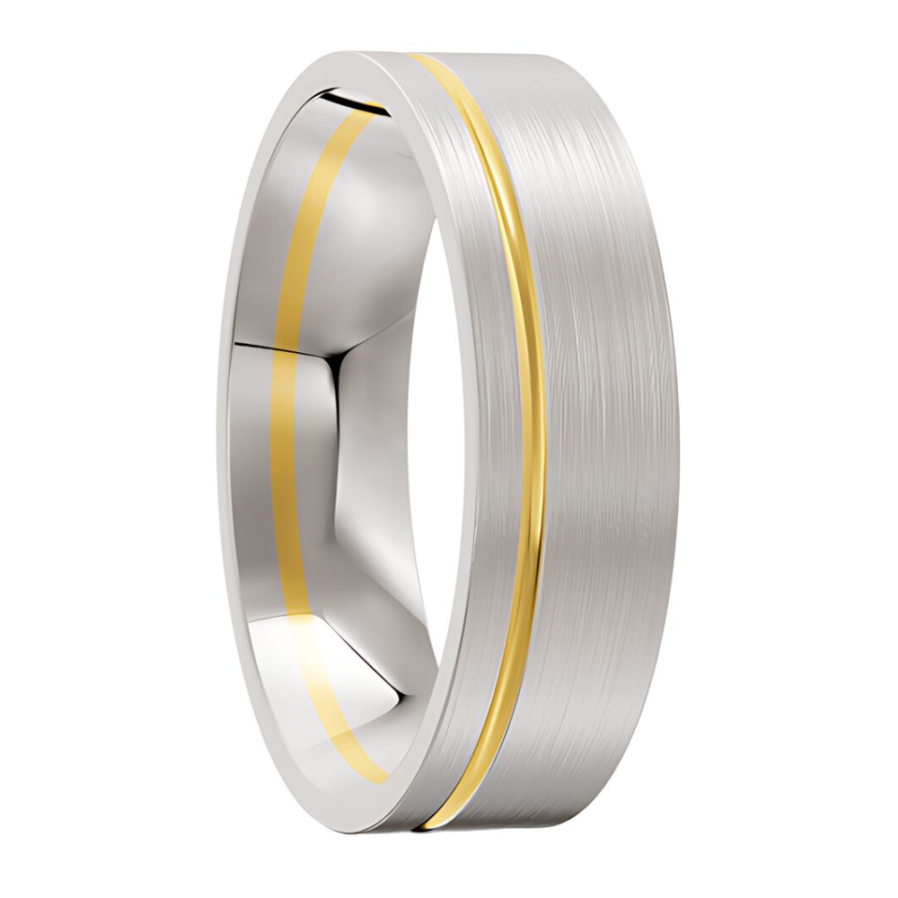 - Finish: Brushed white gold with a polished yellow gold offset groove
