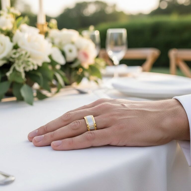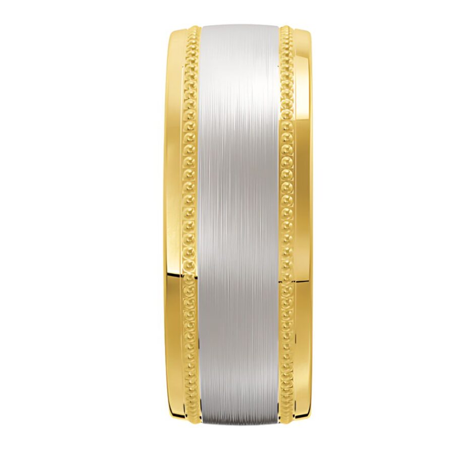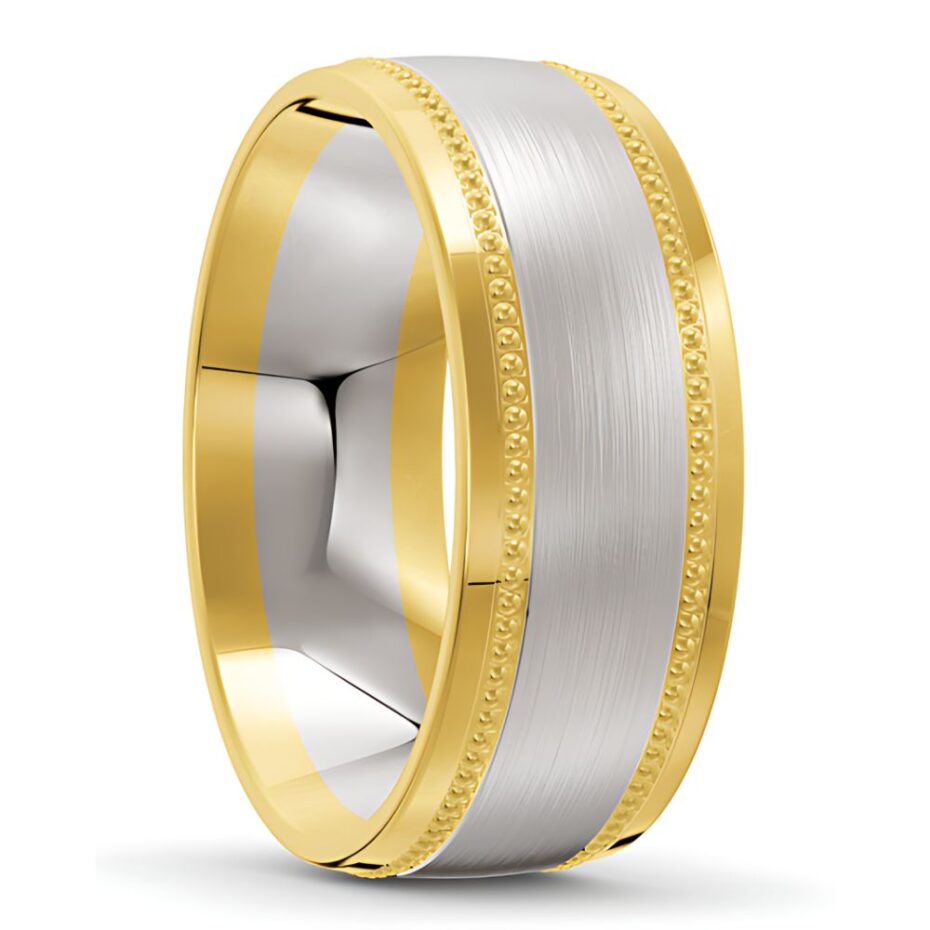 White gold gives you the look of platinum at a lower price point. This ring is alloyed for durability and rhodium-plated for that bright white finish. This one comes in a 8mm width — Worth knowing: the rhodium plating will gradually wear over years and will need replating to maintain its brightness — how often depends on how hard you wear it. Comfortable and well-suited for daily wear. Good for blokes who want a classic white metal ring without the platinum price tag, and are fine with occasional maintenance.